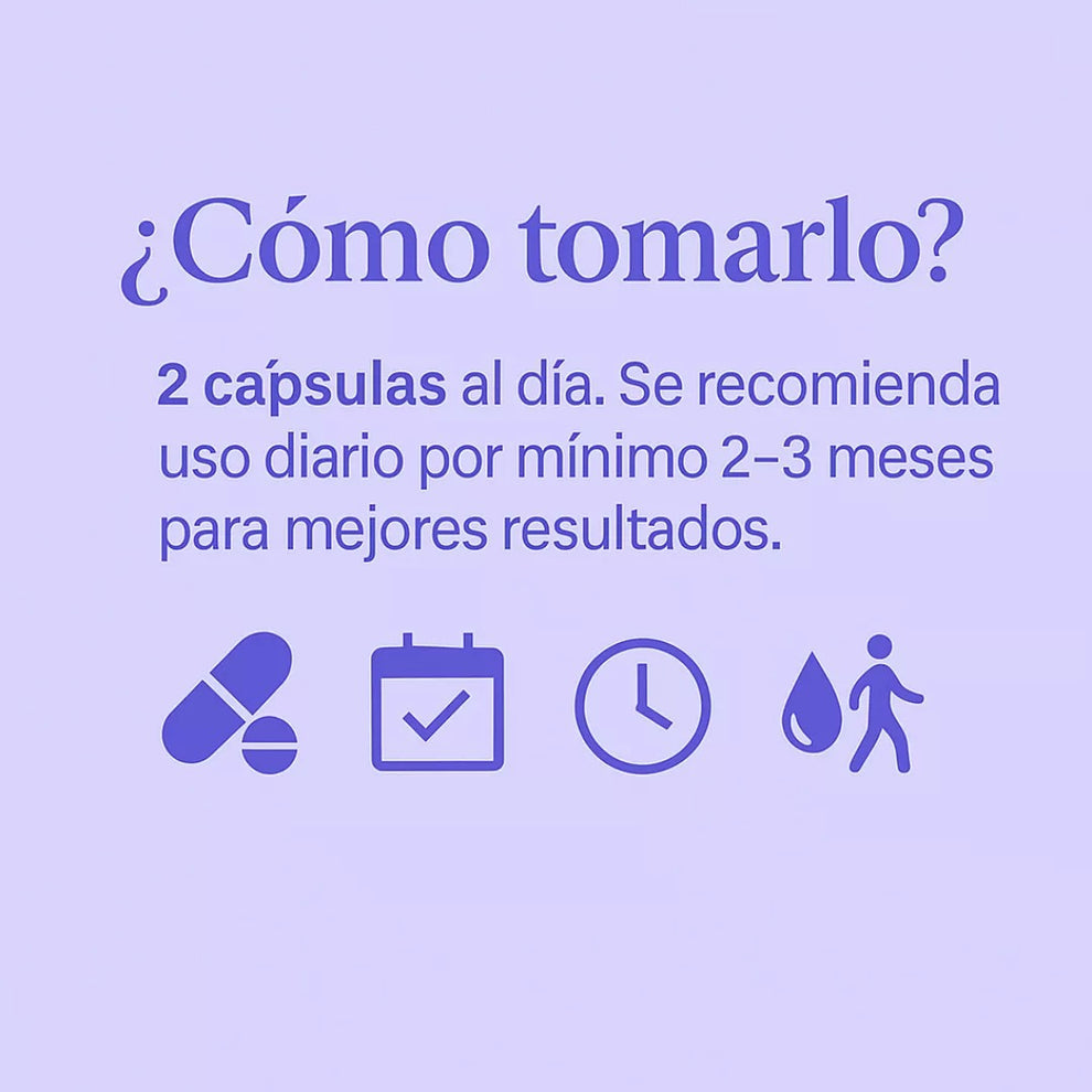 Toma 2 cápsulas al día, preferiblemente con alimentos y un vaso de agua. Puedes tomarlas juntas o separadas según tu rutina diaria. La constancia es clave para obtener los mejores resultados.